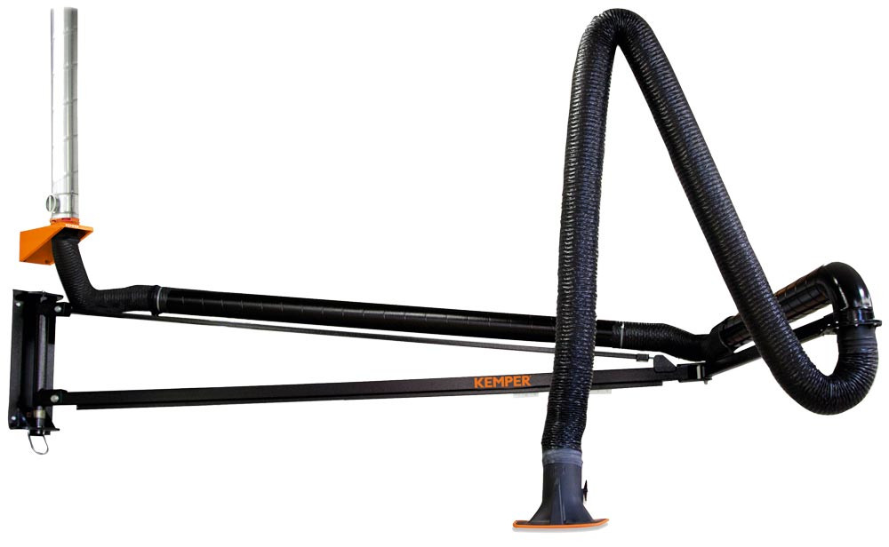 Ausführung: Bestehend aus einem innenliegenden Parallelogramm-Trägergestänge mit Federunterstützung ∙ Schlaucharm aus Polyestergewebe, PVC beschichtet und mit eingeschweißter Stahldrahtspirale ∙ Rohrarm aus pulverbeschichtetem Aluminiumrohr Ø 150 mm und drei flexiblen Schlauchstücken sowie der Absaughaube mit Drosselklappe ∙ Absaugarme halten jede gewünschte Position freitragend bei ∙ Um 360° drehbare Absaughaube in jede Richtung schwenkbar ∙ Ausleger mit 50 kg Tragkraft und mit integrierter