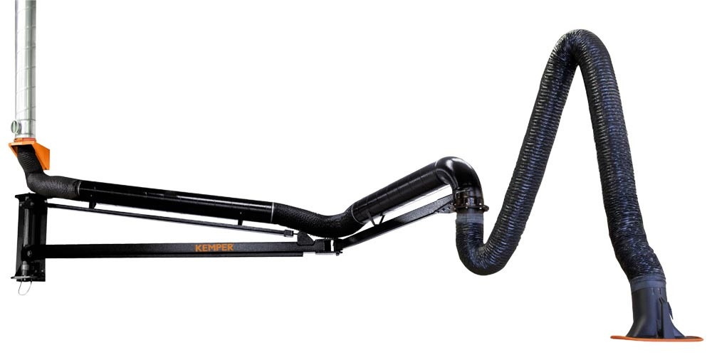 Ausführung: Bestehend aus einem innenliegenden Parallelogramm-Trägergestänge mit Federunterstützung ∙ Schlaucharm aus Polyestergewebe, PVC beschichtet und mit eingeschweißter Stahldrahtspirale ∙ Rohrarm aus pulverbeschichtetem Aluminiumrohr Ø 150 mm und drei flexiblen Schlauchstücken sowie der Absaughaube mit Drosselklappe ∙ Absaugarme halten jede gewünschte Position freitragend bei ∙ Um 360° drehbare Absaughaube in jede Richtung schwenkbar ∙ Ausleger mit 50 kg Tragkraft und mit integrierter
