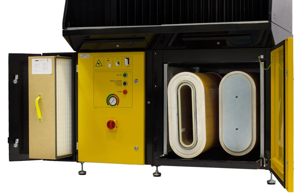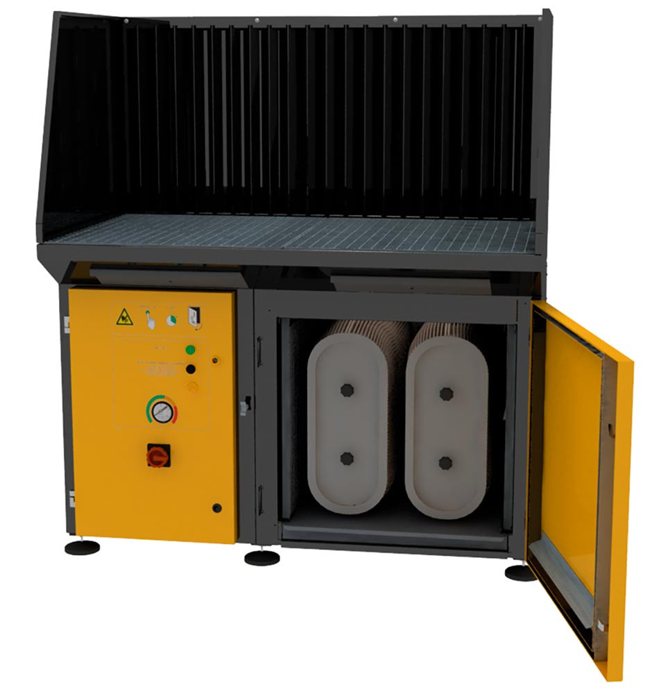 Ausführung: Werkbank mit integrierter Absaugung und Filtration von Schweiß- und Schleifanwendungen ∙ Mit Arbeitsgitter und dreistufigem Vorfiltersystem zum optimalen Funkenfang ∙ Vor- und Hauptfilter mit ausziehbaren Staubschubladen an der Unterseite des Gerätes ∙ Seitenwände schwenkbar - ideal zur Bearbeitung von großen Werkstücken ∙ Differenzdruckgesteuertes Filterreinigungssystem startet automatisch beim Erreichen eines bestimmten Wertes während des laufenden Betriebes (Online Reinigung) - mittels Druckluftimpulse werden die Filterpatronen von innen nach außen einzeln abgereinigt, der integrierte Summer meldet akustisch den Filterwechsel ∙ Mit selbstreinigender Filterpatrone für intensiveren Gebrauch, Ausblasrohr und Schalldämpfer sowie HEPA-Satz nach EN-ISO 21904-2-2020 (W3) - für das Schweißen von Chrom-Nickel-Stählen geeignet