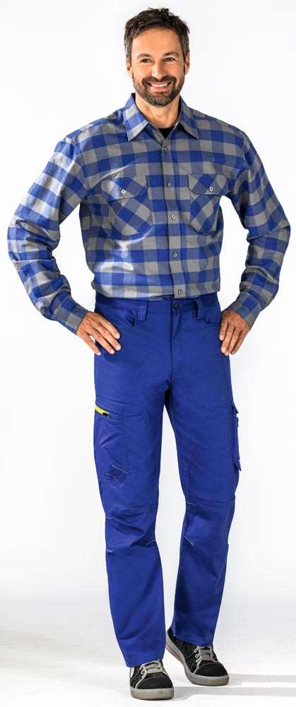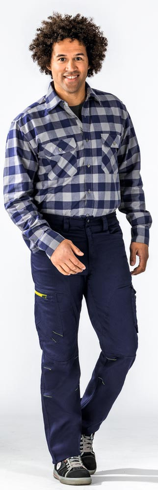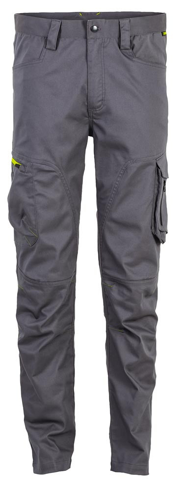 Material 64% Baumwolle, 33% Polyester, 3% Elastan, ca. 265g/m2 ∙ Zwei eingesetzte Beuteltaschen ∙ Oberschenkeltasche links mit Patte und aufgesetzter Tasche mit Reißverschluss ∙ Oberschenkeltasche rechts mit gelbem Reißverschluss ∙ Zwei Gesäßtaschen ∙ Reißverschluss im Hosenschlitz ∙ Bund mit 5 Gürtelschlaufen und Jeansknopf ∙ Reflexapplikation an rechter Oberschenkeltasche