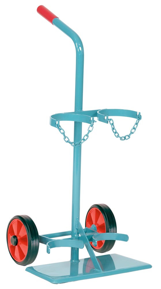 Ausführung: Flaschenwagen für 2 Kleinflaschen ohne Werkzeugkasten ∙ Stabile Stahlrohrkonstruktion aus 1"-Rohr mit Standplatte und Kettensicherung ∙ Mit rotem PVC-Handgriff ∙ Radnabe rollengelagert