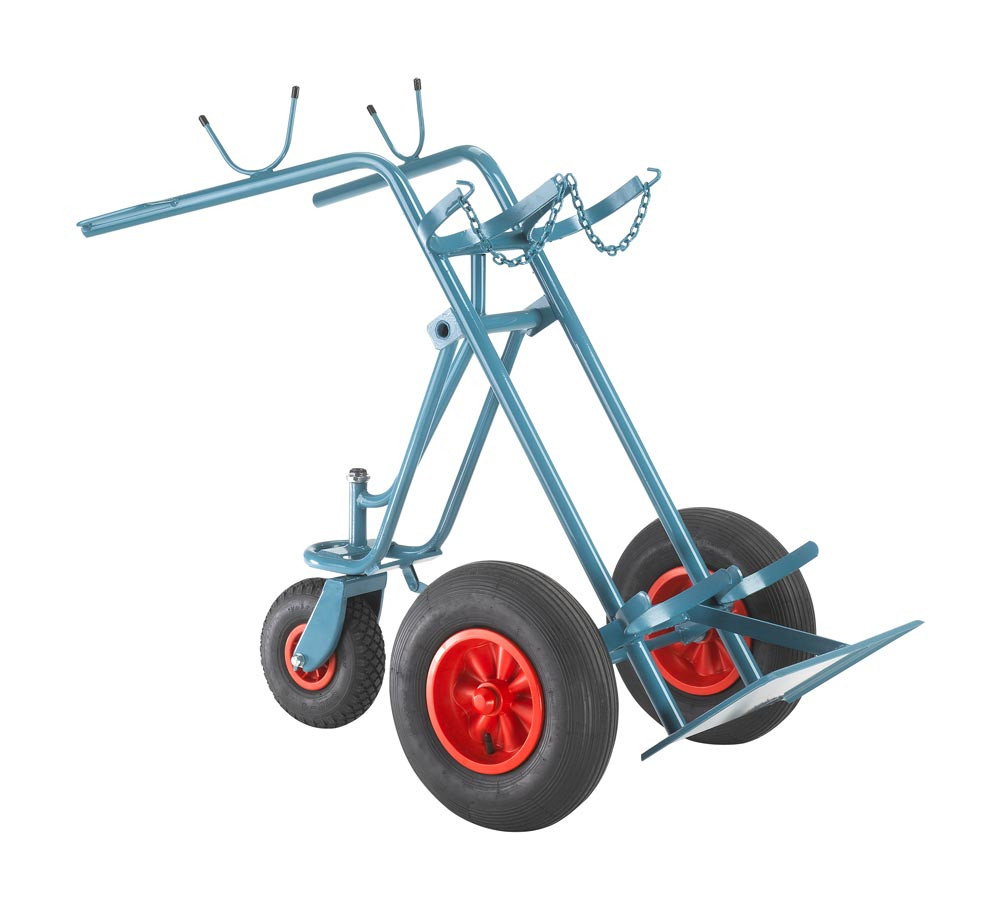 Ausführung: Flaschenwagen für 2 Großflaschen ∙ Stabile Stahlrohrkonstruktion aus 1"-Rohr mit Standplatte und Kettensicherung ∙ Mit geschweißtem Handschutzbügel und Schlauchhalterung auf den Holmen ∙ Zusätzlich ausklappbares Spornrad ∙ Radnabe rollengelagert ∙ Auf Anfrage mit Werkzeugkasten lieferbar