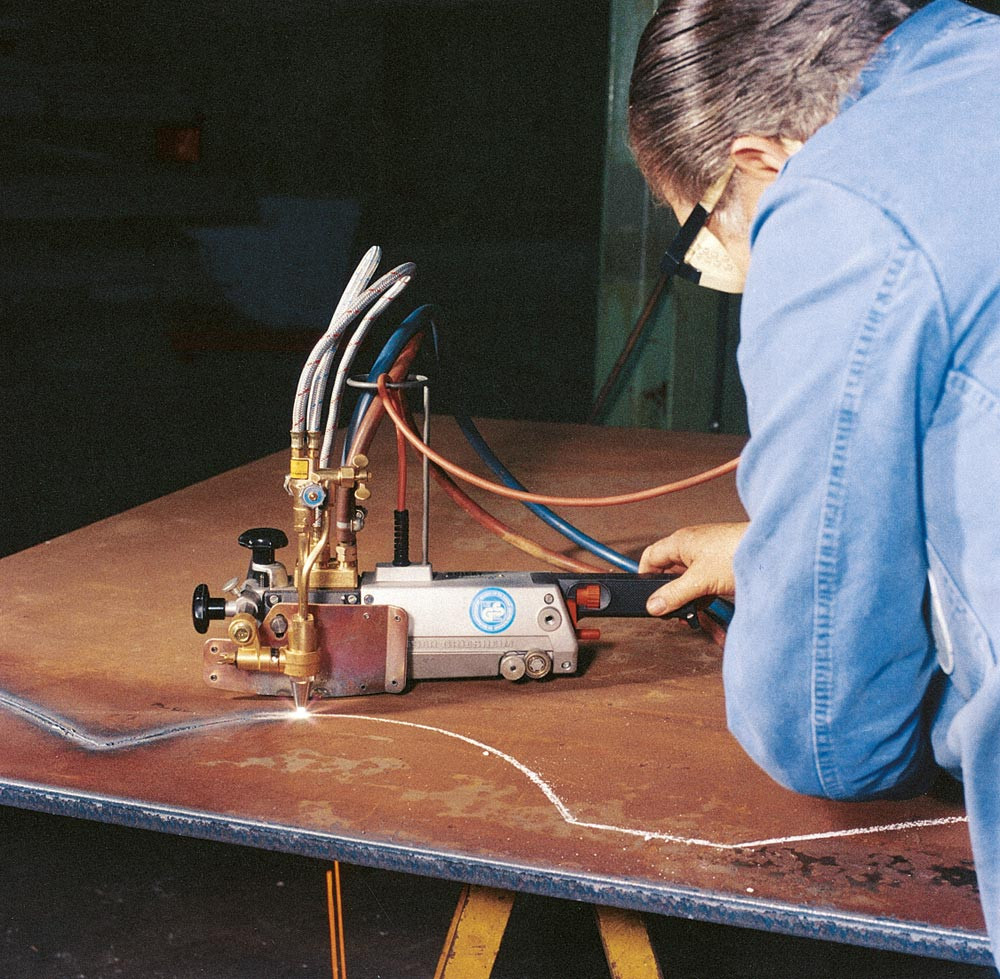 Ausführung: Vielseitig einsetzbare Brennschneidmaschine in kompakter Bauweise ∙ Doppelt isoliert ∙ Formschnitte einfach von Hand geführt ∙ Mit Wärmeschutzschild, Kreisschneideinrichtung und Maschinenschneidbrenner ∙ Standardmäßig für Materialdicken von 3 - 100 mm ∙