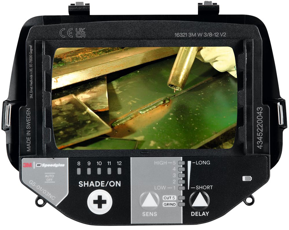 Ausführung: 3M™ Speedglas™ Hochleistungs-Schweißmaske G5-03 E ∙ Schweißfilter mit Natural Color Technology ∙ Vielseitige und kostengünstige Schweißmaske der G5 Serie ∙ Geeignet für Schweiß- und Schleifarbeiten ∙ Schutzstufen DIN 3/8-12 ∙ Sichtfeld 55 x 107mm ∙ Aufhellzeit (Delay-Funktion) sowie feste Dunkelstufen (Lock-In Dark State) sind einstellbar ∙ Umschaltzeit von Hell auf Dunkel beträgt 0,1ms, die Empfindlichkeit (Sensitivity) der Sensoren lässt sich individuell auf verschiedene Schweißarbeiten anpassen