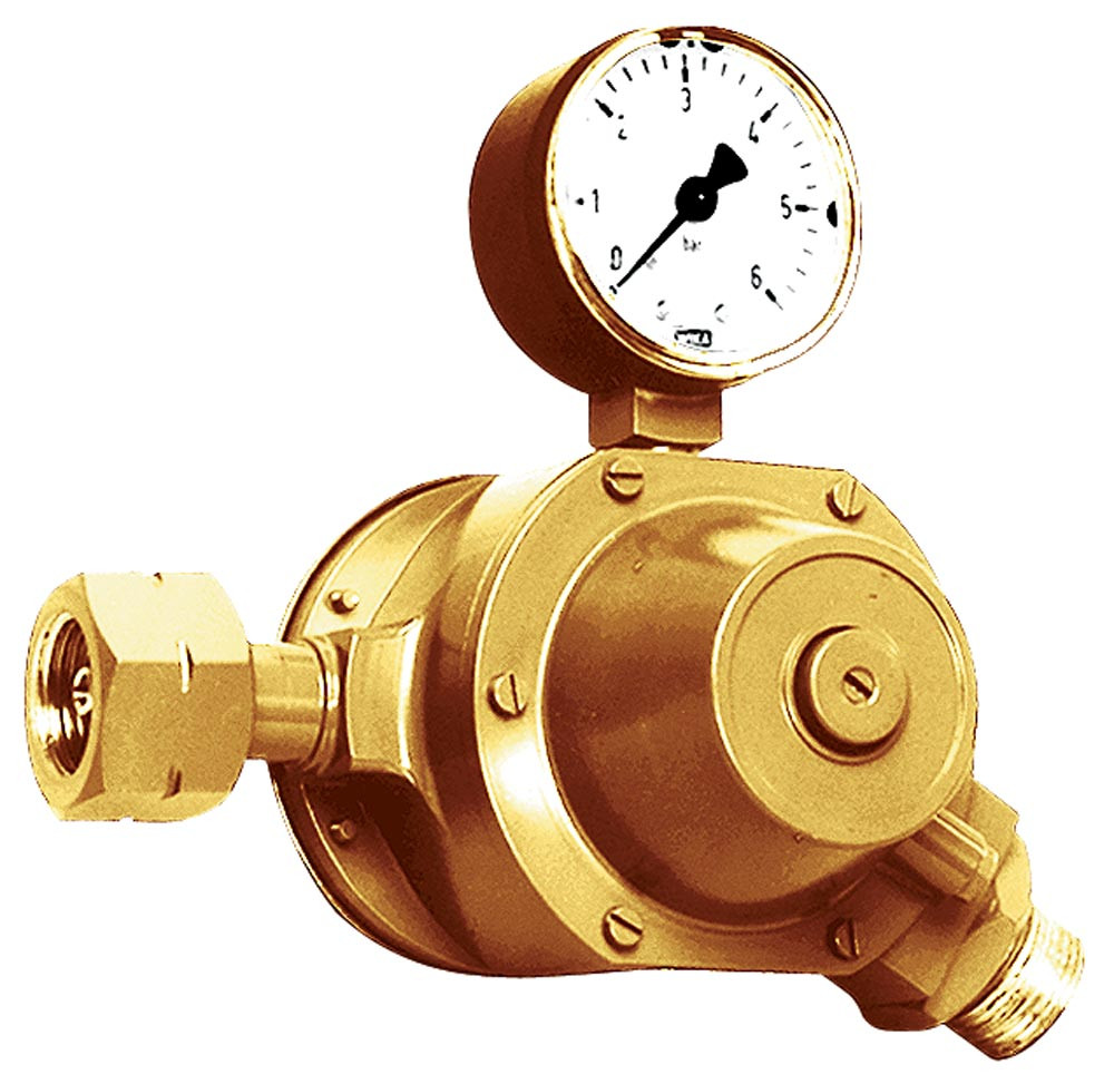 Ausführung: Druckregler mit stufenlos einstellbarem Arbeitsdruck ∙ Mit integrierter Leckgassicherung und Manometer ∙ Anschlüsse nach DIN 477 und DIN DVGW geprüft
