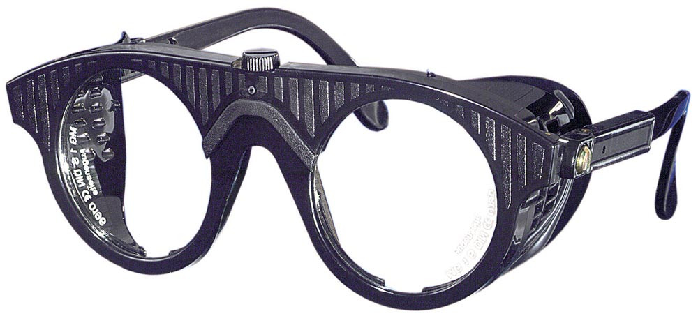 Ausführung: Nach EN 166 · Aus Nylon mit Seitenblenden · Mit Mittelschraube für leichten Glasaustausch · Glasgröße 50 mm rund ∙ Farbe schwarz