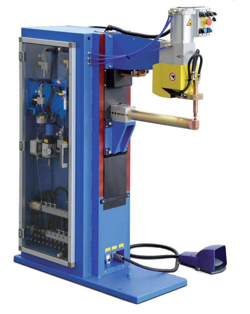 Ausführung: Schweißmaschine mit Mittelfrequenztechnologie, wodurch eine hohe Qualität der Schweißpunkte erreicht wird ∙ Reduzierte Schweißstromanstiegszeiten, Zeiteinstellung in ms, symmetrische Last auf der Netzleitung ∙ Modularer Aufbau der Struktur mit der Möglichkeit die Position des Schweißzylinders umzukehren oder mit zwei gegenüberliegenden Schweißzylindern zu arbeiten ∙ Zylinder mit verstärktem verchromtem Stahlschaft für hohe Belastung und lange Lebensdauer ∙ Einstellbare Verdrehsicherung ∙ Alle pneumatischen Komponenten sind schmierungsfrei ∙ Einstellbarer Doppelhub als Option (S 800 226) ∙ Filtereinheit mit Druckluftabschaltung, angeschlossen an die Notsteuerung ∙ Flüssigkeitsgekühlter Sekundärkreislauf und Transformator, an die Notsteuerung angeschlossenes hydraulisches Kreislaufabsperrventil ∙ Durchfluss- und Temperaturmesser für Kühlwasser ∙ Zweistufiges elektrisches Fußpedal, das die Einspannung der Werkstücke über die Zwischenstufe und den Übergang zum Schweißen erst nach Überprüfung der korrekten Positionierung durch Aktivierung der zweiten Stufe zulässt ∙ Möglichkeit des Anschlusses eines zweiten elektrischen Fußpedals (S 800 227) als Option zum Schweißen mit einem anderen Schweißprogramm ∙ Zweihandbedienung mit Simultansteuerung für maximale Sicherheit und abnehmbarem Schlüsselwahlschalter für die Wahl der Steuergeräte als Option (S 800 228) ∙ Die Schweißsteuerung und die Bedienelemente für die Kontrolle der Punktschweißmaschine sind an einem hängenden Arm für eine maximal ergonomische Bedienung der Punktschweißmaschine installiert als Option (S 800 229)
