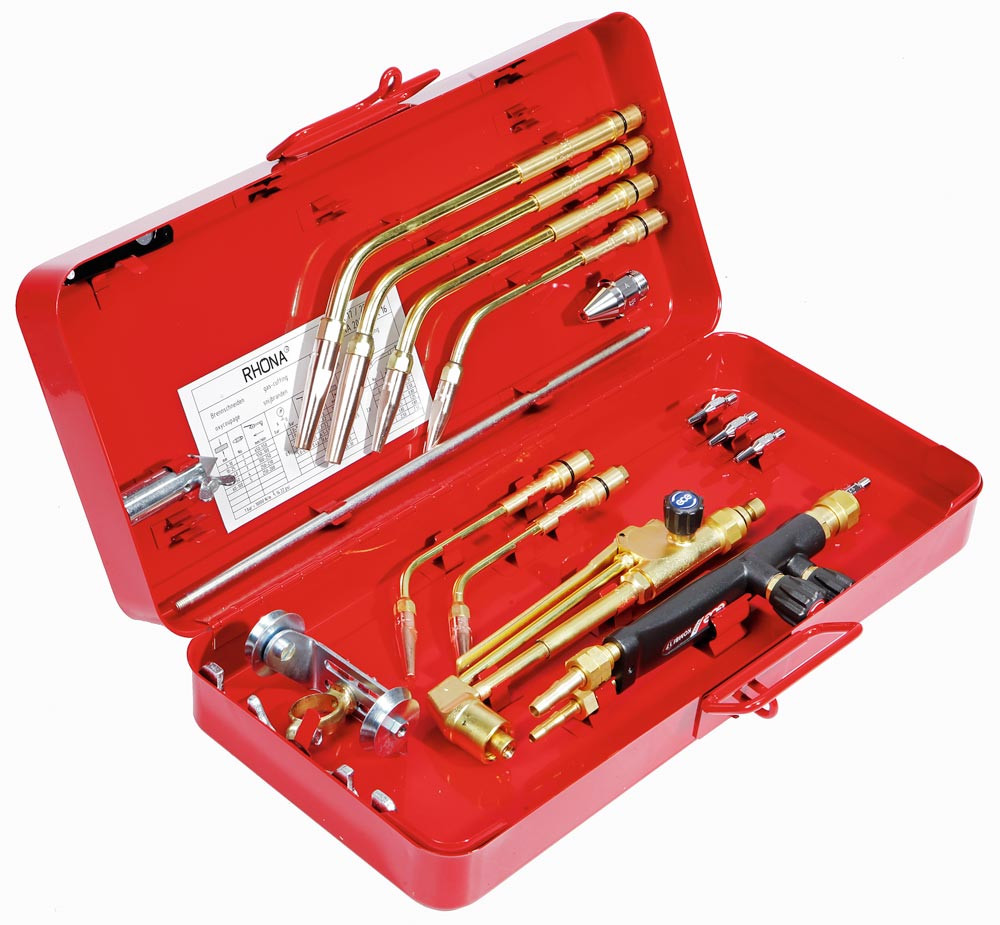 Ausführung: Nach DIN/EN/ISO 5172 ∙In Stahlblechkassette mit Aluminium-Griffstück, Federhebel-Schneideinsatz, 6 (0,5-14 mm), bzw. 8 (0,5-30 mm) Schweißeinsätze, 4 Schneiddüsen (bis 100 mm), Führungswagen, Zirkelstange mit Körnerspitze, Satz Düsenreinigungsbohrer, Montageschlüssel