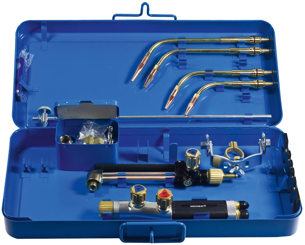 Ausführung: Stahlblechkassette mit Griffstück 2221 ∙ 4 Schweißeinsätze 111-A von 1-9 mm, Federhebel-Schneideinsatz 1711-A ∙ Schlitzdüse A-RS 3-40 mm ∙ Heizdüse 2-100 mm ∙ Brennerwagen mit Zirkelstange, Brennerschlüssel, Düsenreiniger und Betriebsanleitung