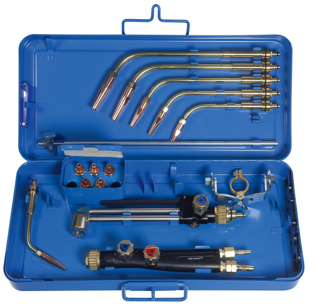 Ausführung: In Stahlblechkassette mit Griffstück 2020, Federhebel-Schneideinsatz 2730-A, Blockdüsen A-B 3-100 mm, Schweißeinsätze Typ 210-A 0,5-14 mm, Brennerwagen, Zirkelstange, Brennerschlüssel, Düsenreiniger und Betriebsanleitung