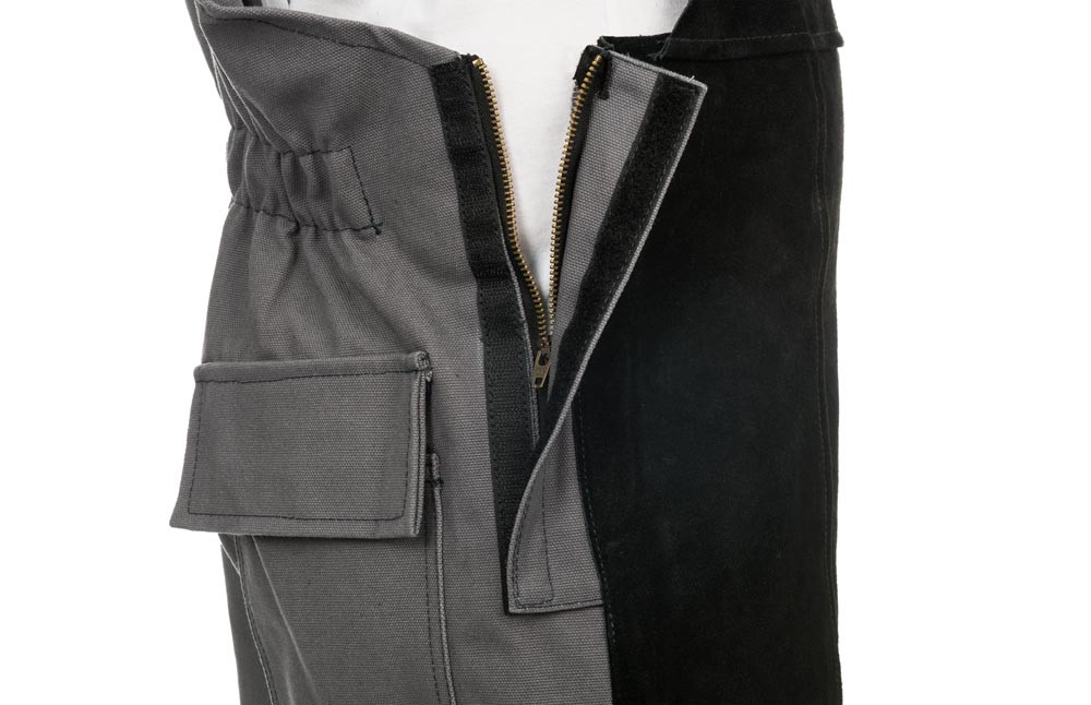 Zertifiziert nach EN ISO 11611:2015 CLASS 2/A1+A2, TÜV BP 60122567 0001 und TÜV 21260757 003 ∙ Aus flammenresistenter Baumwolle, ca. 520 g/m2 mit Rindspaltleder-Verstärkungen für schwere Arbeiten ∙ Hoher Tragekomfort und flexibel ∙ Farbe grau/schwarz