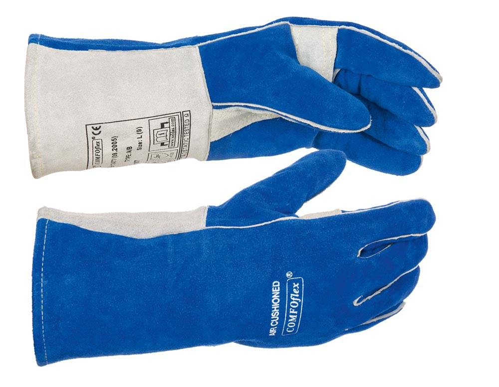Schweißerhandschuhe mit verstärktem Daumen blau, 35 cm lang, Gr. XL