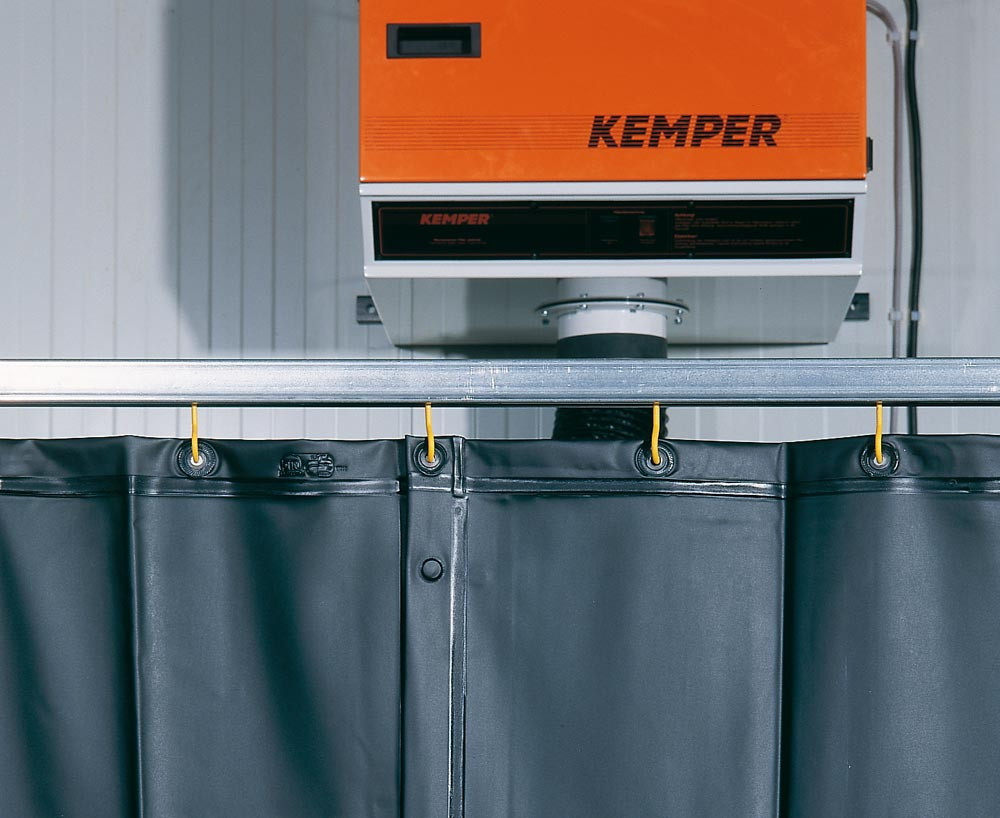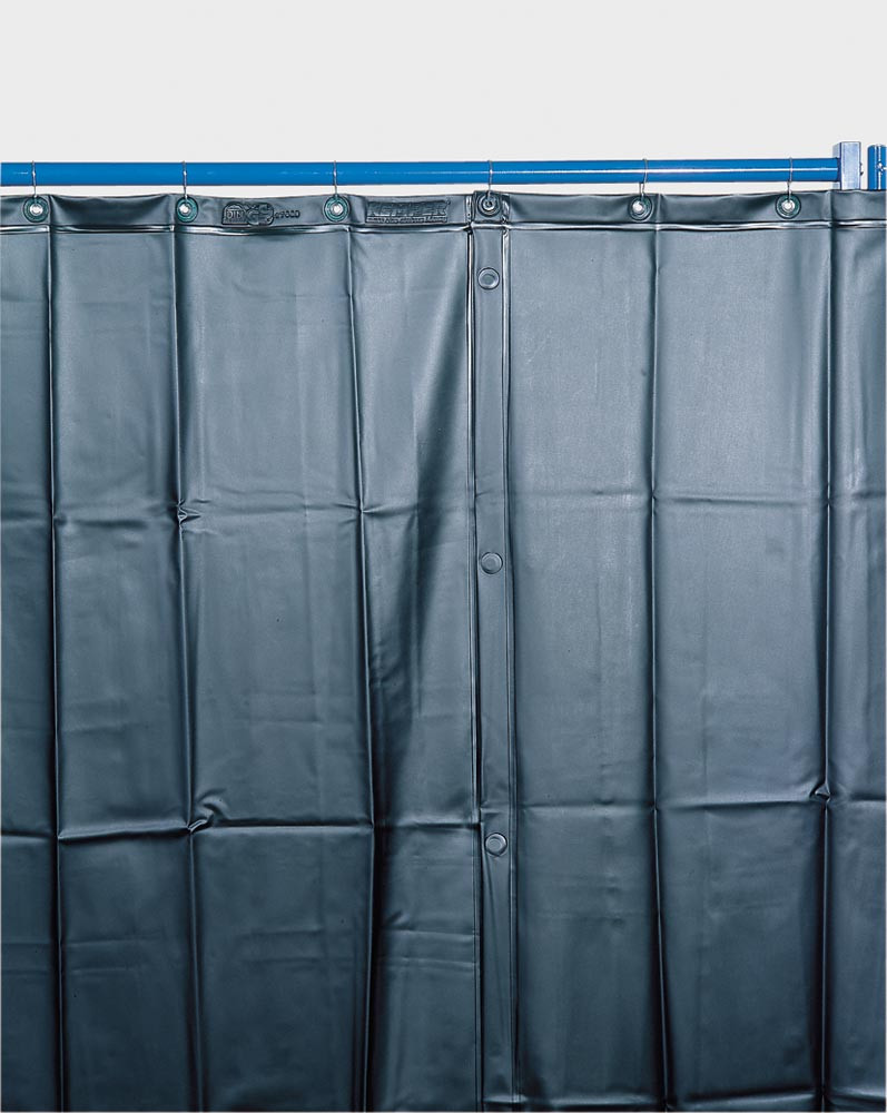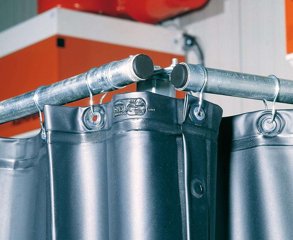 Ausführung: Schutzvorhang aus robustem, ca. 0,4 mm starken Kunststoff ∙ Funkenfest, schwer entflammbar ∙ Nach DIN EN ISO 25980 geprüft ∙ Zur Befestigung an einem Rohr oder an einem C-Profil ∙ Allseitig einreißfest gesäumt ∙ Verstärkte Ringösen zur Befestigung ∙ Eingeschweißte Kunststoffdruckknöpfe