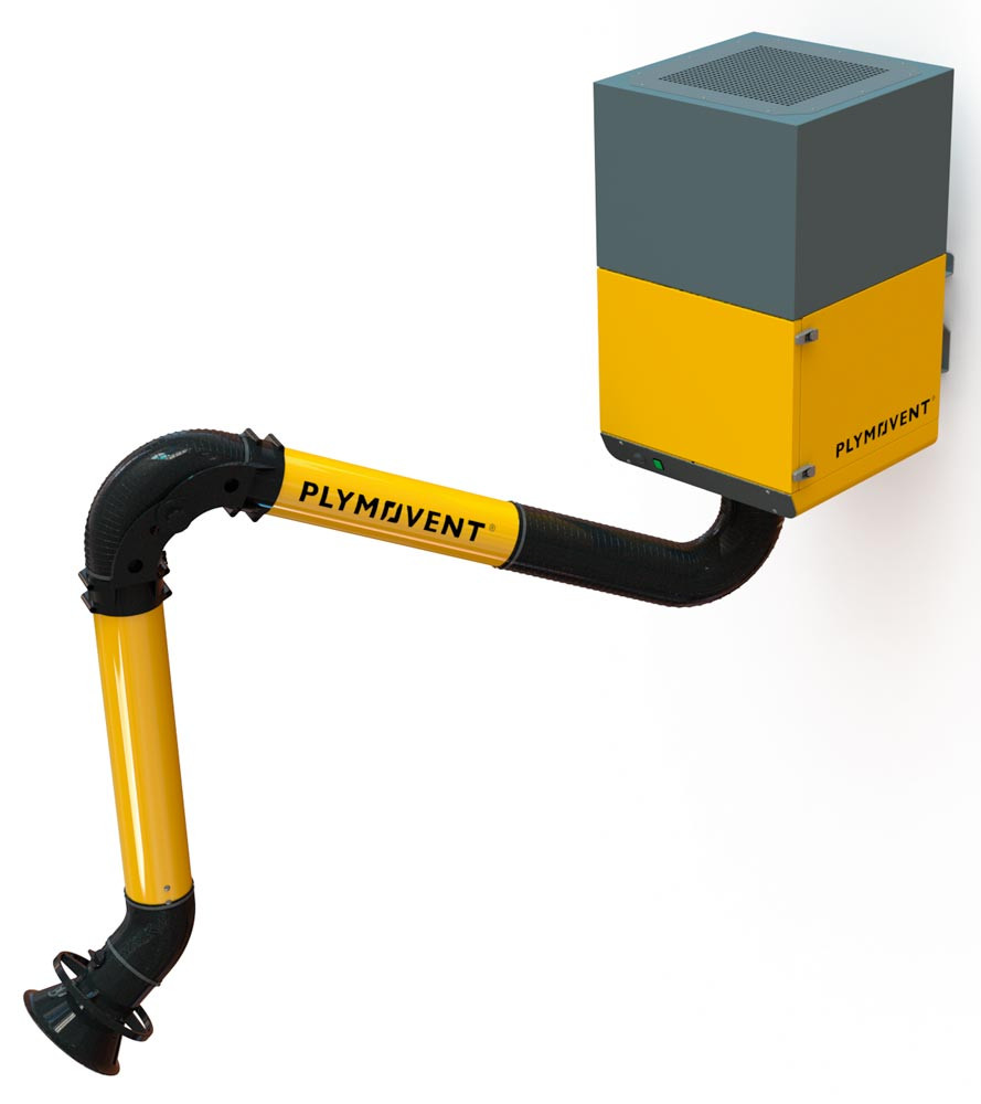 Ausführung: Stationäre Schweißrauch-Absaugung mit integriertem Ventilator, Bedienelement und Einweg-Filterpaket ∙ Stabiler Metallrohrarm mit außenliegendem Kniegelenk ∙ Extragroßer Filter (26 qm) der Filterklasse HEPA E 12 ∙ Entspricht der Schweißrauchklasse W3 nach ISO-EN 21904-2:2020, geeignet zum Schweißen von Chrom-Nickel-Stählen