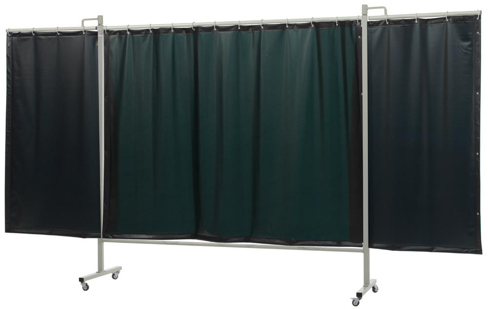 Ausführung: 3-teilige Schutzwand nach DIN EN ISO 25980 geprüft ∙ Mit Folienvorhang zum Schutz vor Strahlung, Schweißlichtbögen und Spritzern ∙ Grundgestell mit 2 ausklappbaren Schwenkarmen mit je 80 cm Breite ∙ 4 Standard-Lenkrollen Ø 50 mm (2 mit Bremse, 2 ohne)
