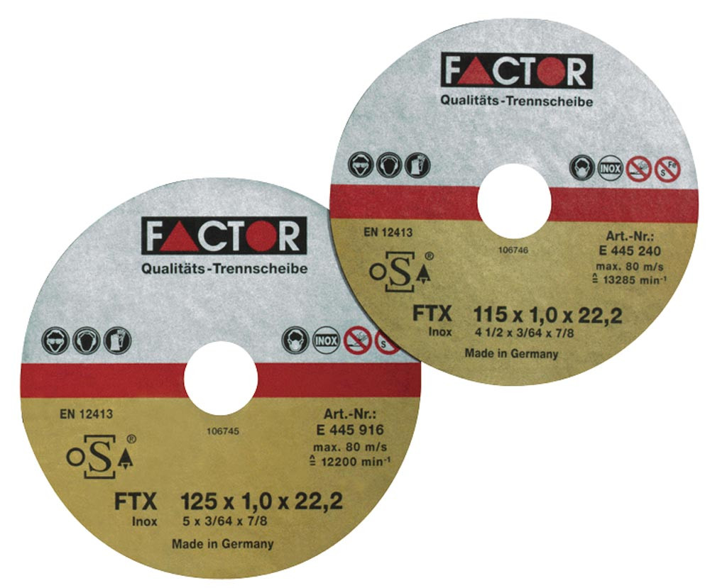 Sehr harte, eisen- und schwefelfreie Trennscheiben mit faserstoffverstärkter Kunstharzbindung ∙ Entsprechen den oSa-Sicherheitsrichtlinien gemäß EN 12413 ∙ Schnelles, präzises, müheloses, zeit- und kostensparendes Arbeiten