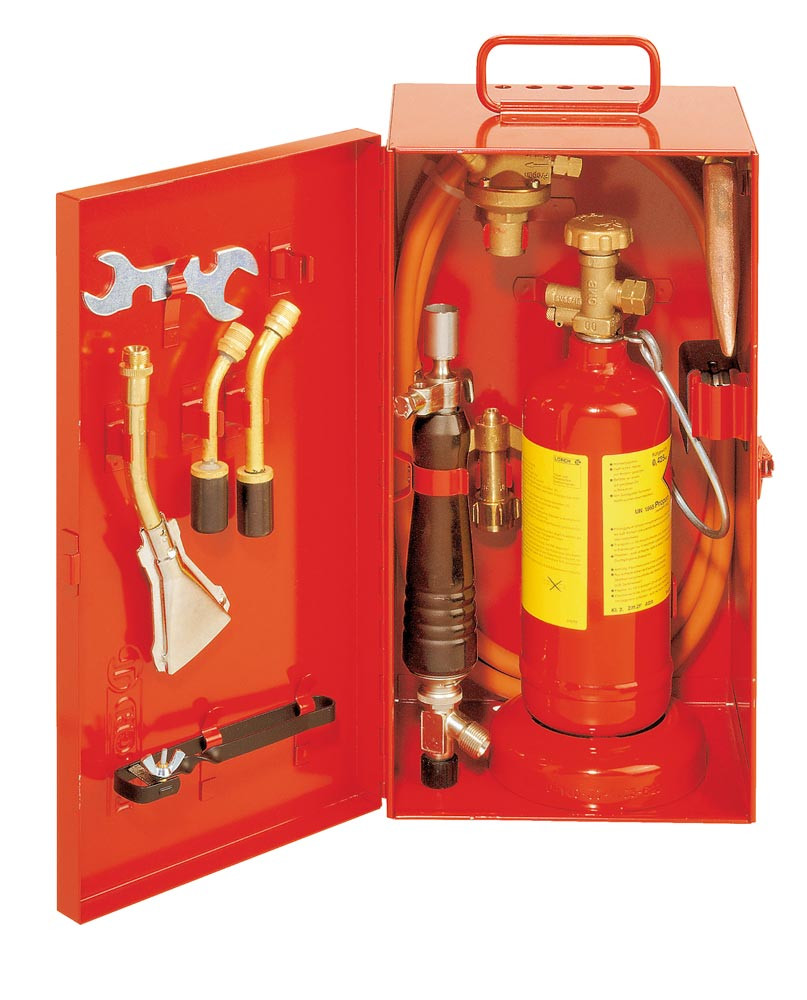 Ausführung: Tragbare Propan-Weichlötgarnitur bestehend aus Handgriff "Classic" mit Feinregulierung, Kolbenbrenner mit Kolbenhalter und Windschutz, mit Kupferstück 350 g in Hammerform, gekröpft, Punktbrenner 5 mm und 7 mm, Breitbrenner 40 mm, Propan-Kleinstflasche (leer) 425 g Füllmenge mit Aufhängehaken, Umfüllstutzen, Propan-Kleinregler 1,5 bar fest eingestellt, Propan-HD-Schlauch 2 m mit G 3/8" LH, Gasanzünder und Gabelschlüssel im robusten Stahlblechkasten